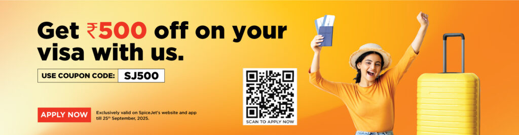 SpiceJet Coupon Code – Get ₹500 OFF on Your Visa with Us. Use Given Coupon Code at Checkout Page. Visit the Landing Page and Apply Now!